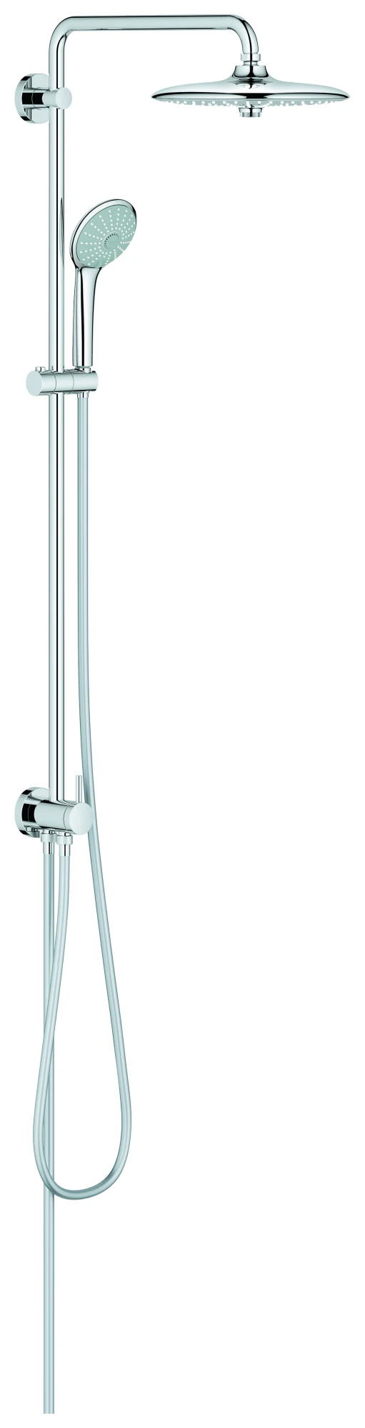Euphoria System 260Duschsystem mit Umstellung für die Wandmontagebestehend aus:horizontal schwenkbarer 450 mm DuscharmWechsel zwischen Hand- und Kopfbrause mittels UmstellungEuphoria 260 Kopfbrause (26 457)3 Strahlarten: Rain, SmartRain, Jetmit Kugelgelenk, Drehwinkel ± 15°Handbrause Euphoria 110 Massage (27 239)3 Strahlarten: Rain, SmartRain, Massagein der Höhe verstellbar mittels GleitelementBrauseschlauch Silverflex 1.750 mm (28 388)Silverflex Brauseschlauch 800 mmWasseranschluss über 1/2″-Gewinde des 800 mm Brauseschlauchsan Armatur / WandabgangsbogenGROHE Water Saving 9,5 l/min DurchflusskonstanthalterGROHE DreamSpray Perfektes StrahlbildGROHE Long-Life OberflächeSpeedClean Antikalk-SystemTwistStop gegen Verdrehen des Brauseschlauchsfür Durchlauferhitzer ab 18 kW/h geeignetMindestdurchfluss 7 l/minSerie / Kollektion: Euphoria System 260Modell: 27421_2Typ: DuschsystemDurchflussmenge: 7,5 l/minAnschluss: Innengewinde Durchflussmenge (max.): 8,5 l/minBeleuchtung: nein Anschlussdurchmesser: 1/2″ Temperaturregelung: ohne Abmessungen:Höhe: 1127 mmTiefe: 450 mmDurchmesser &8960;: 260 mm