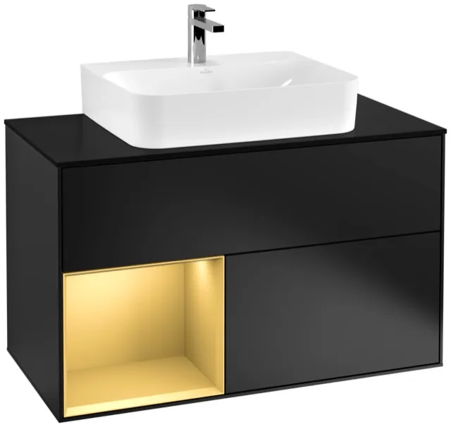 Beleuchtung: ohne | Regalelement: ohne | Schubladen: 2 | Abdeckplattenfarbe: Glass Black Matt | Becken: mittig | Front- & Korpusfarbe: Anthracite Matt Lacquer | Modell: F22 | Regalfarbe: ohne Regalelement