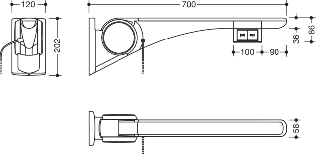 HEWI Stützklappgriff Basic, Ausleger aus Aluminium, pulverbeschichtet, glänzend mit Griffpad aus Kunststoff, mit hochglänzend verchromten Designelementen, hochwertige Kunststoffoberfläche und kratzfeste Pulverbeschichtung, Ausladung 700 mm, mit Spül-/Funktionstaste (E-Ausführung), Ausführung links, einfache Montage durch separate Installation der Montageplatte aus Edelstahl, matt geschliffen, belastbar bis 100 kg, wird gemäß CE- und UKCA-Verordnung (EU) 2017/745 über Medizinprodukte produziert.