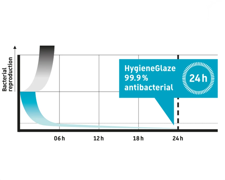 Duravit hebt mit HygieneGlaze® den Hygienestandard für WC, Urinal und Waschbecken auf ein neues Niveau. Die antibakterielle Glasur wird bereits während des Brennvorgangs in die Keramik integriert, wodurch sie besonders wirksam und schnell gegen Bakterien vorgeht. Mit der weiterentwickelten Version HygieneGlaze® Plus geht Duravit noch einen Schritt weiter: Sie vereint die effektive Keimhemmung mit einer besonders glatten und pflegeleichten Oberfläche.