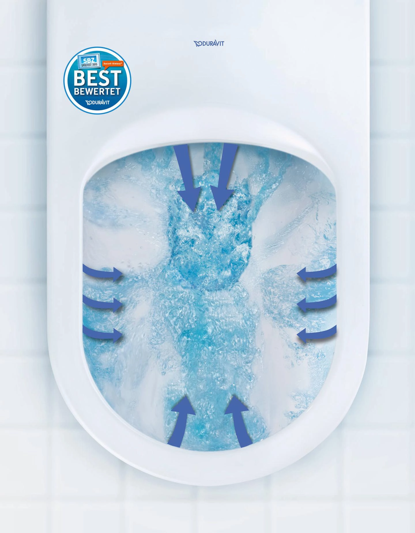 - Innovative Wasserführung selbst bei rechteckiger Außenform sorgt für eine vollständige Innenbereichsspülung