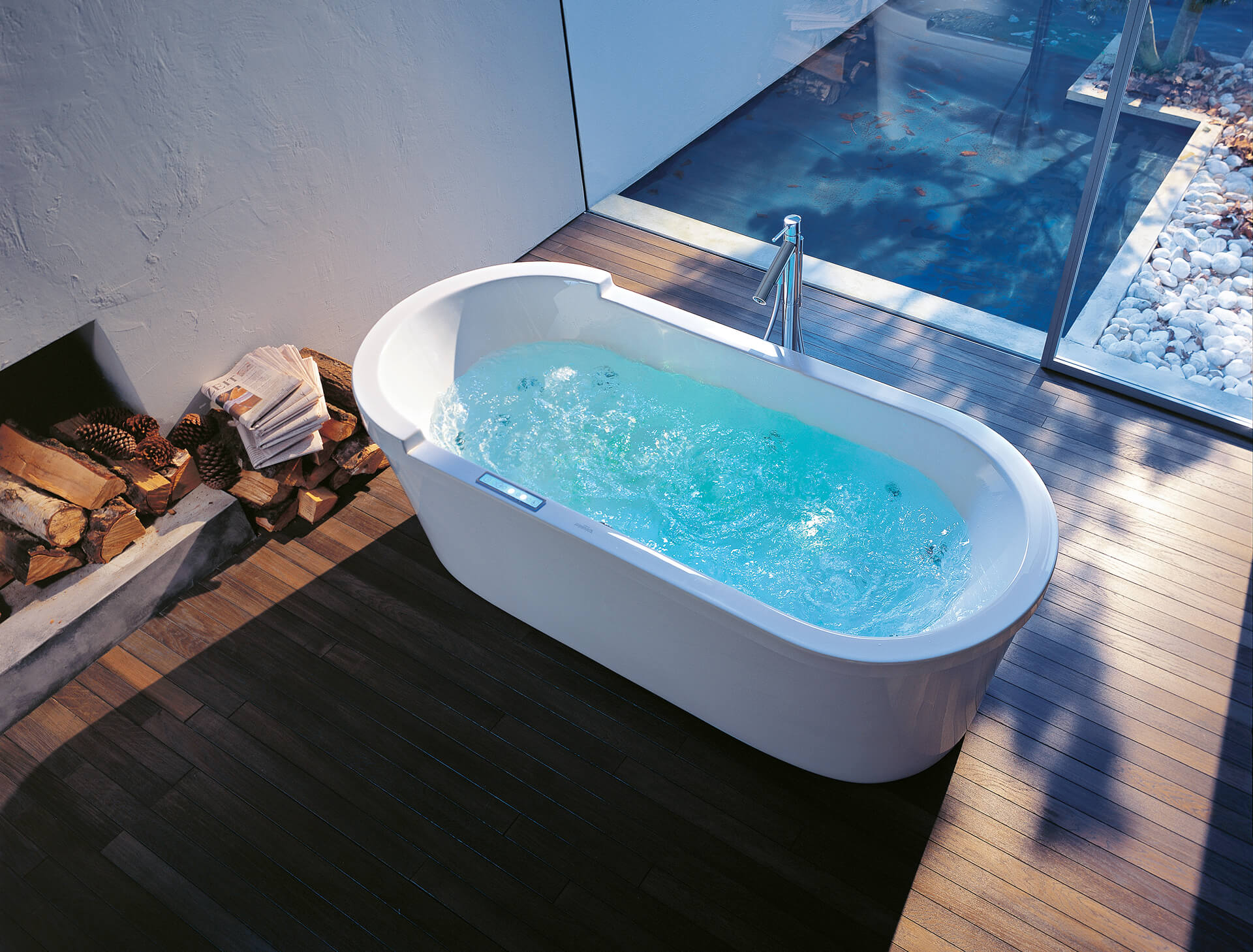 Zurückhaltend in der Optik, deutlich spürbar in der Wirkung: Beim neuen optimierten Whirlsystem Air wurden die Luftdüsen nahezu unsichtbar in die Wanne integriert. Bei den Duravit Acrylwannen haben die flachen weißen Bodendüsen nur 8 mm Durchmesser. Noch unauffälliger sind sie bei den Duravit Wannen aus DuraSolid®, weil sie direkt in den Wannenboden integriert wurden. Ein- und ausschaltbar über einen flachen diskreten Taster mit one-touch-Bedienung, bieten beide Varianten eine angenehme Massage des Badenden durch feine Luftbeimischung.