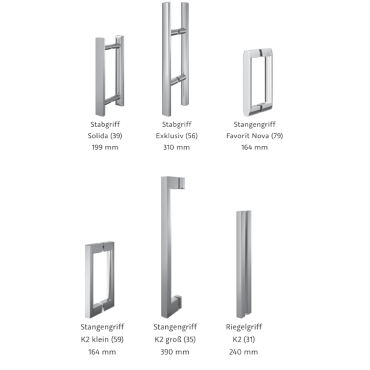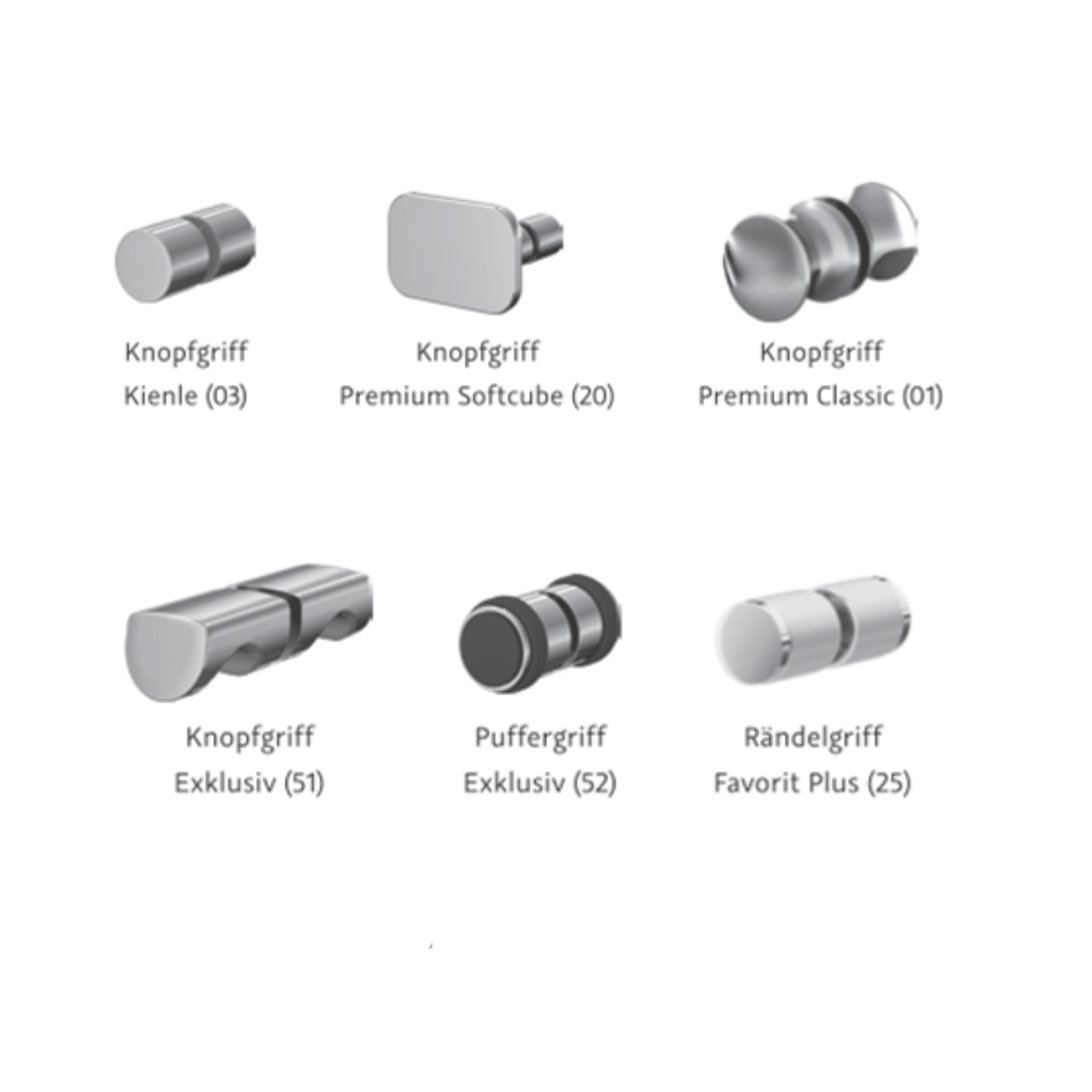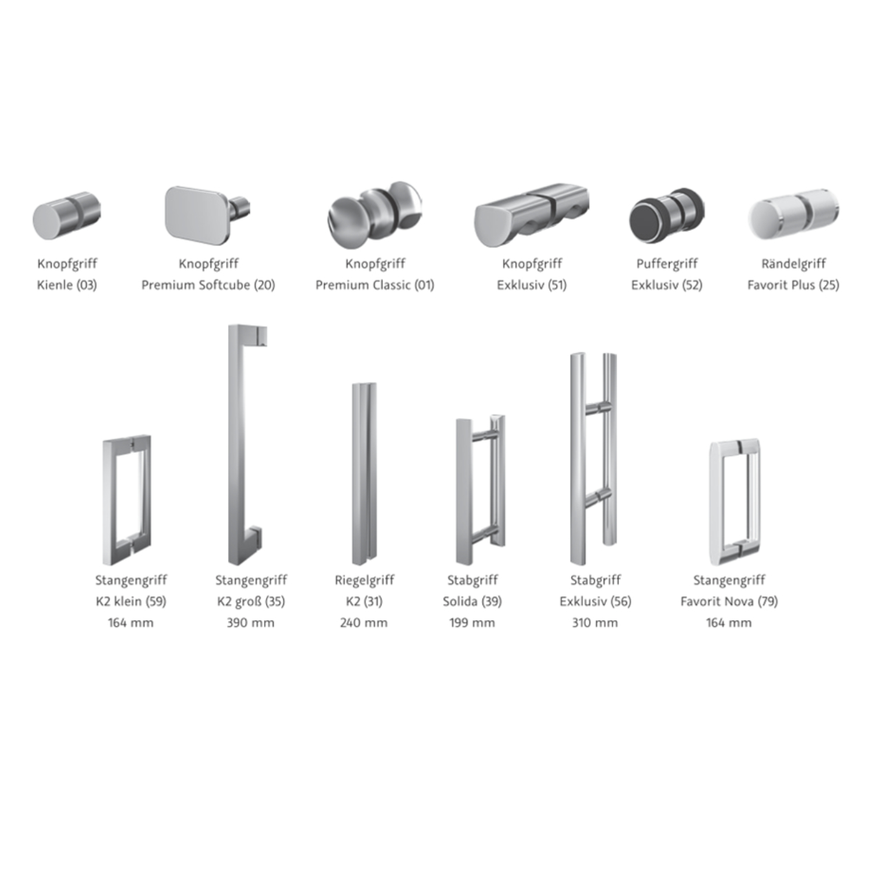 Die ergonomischen Griffe verschiedener Designlinien sind nicht nur funktional, sondern dienen geschickt ausgewählt auch als Designelement. Ob Stangen-, Knopf- oder Puffergriffe, klein oder groß - je nach Kabinenart und Einrichtungsstil finden Sie hier das besondere I-Tüpfelchen für Ihre Duschlösung.