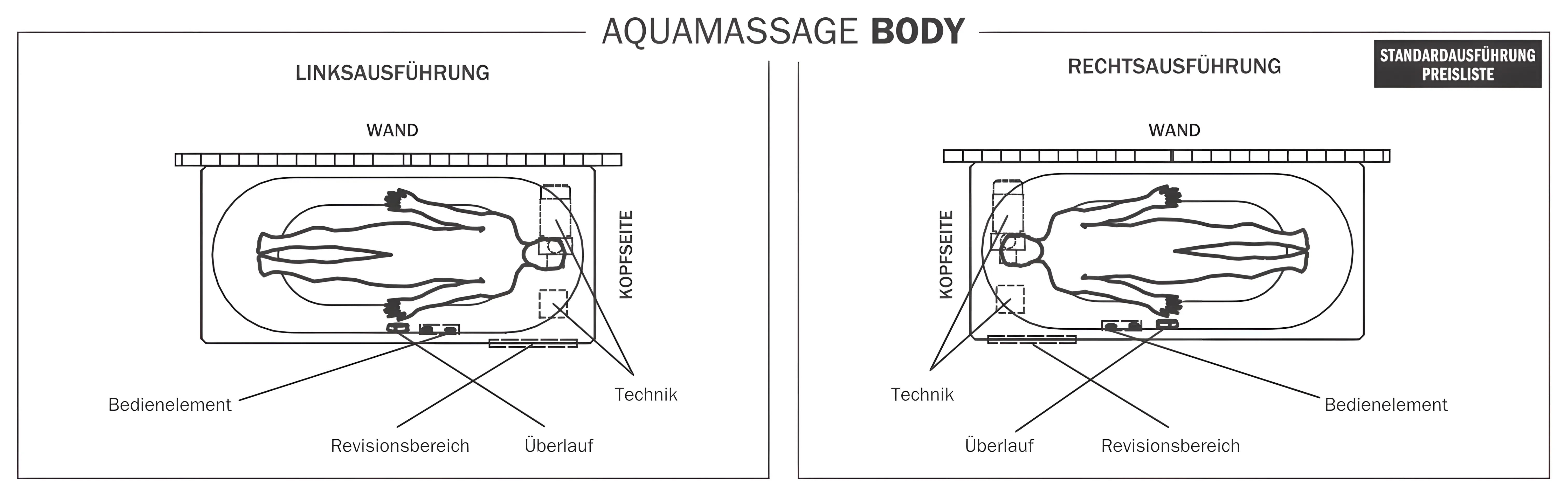 Tauchen Sie ein in die ultimative Entspannung mit dem Whirlsystem Aquamassage Body. Dieses innovative System verwöhnt Ihren Körper mit einer einzigartigen Kombination aus Wasser und Luft, um Verspannungen effektiv zu lösen und ein Gefühl der Erholung zu bieten. Das Aquamassage Body-System ist mit speziellen Wasserstrahldüsen ausgestattet, die mit Luft angereichert sind. Dadurch entsteht eine sanfte und dennoch kraftvolle Massage, die tief in Ihre Muskeln eindringt und Verspannungen löst. Die angereicherten Wasserstrahlen umhüllen Ihren Körper und schaffen eine wohltuende und entspannende Atmosphäre. Mit 6 Seitendüsen haben Sie die Möglichkeit, die Ausrichtung der Wasserstrahlen individuell anzupassen. So können Sie gezielt auf die Bereiche eingehen, in denen Sie Verspannungen spüren und eine besonders intensive Massage erfahren möchten. Das Aquamassage Body-System bietet Ihnen nicht nur eine effektive Verspannungslösung, sondern auch ein komfortables und luxuriöses Badeerlebnis. Die hochwertige Verarbeitung und das ansprechende Design sorgen für ein Wellness-Erlebnis, das alle Sinne anspricht.