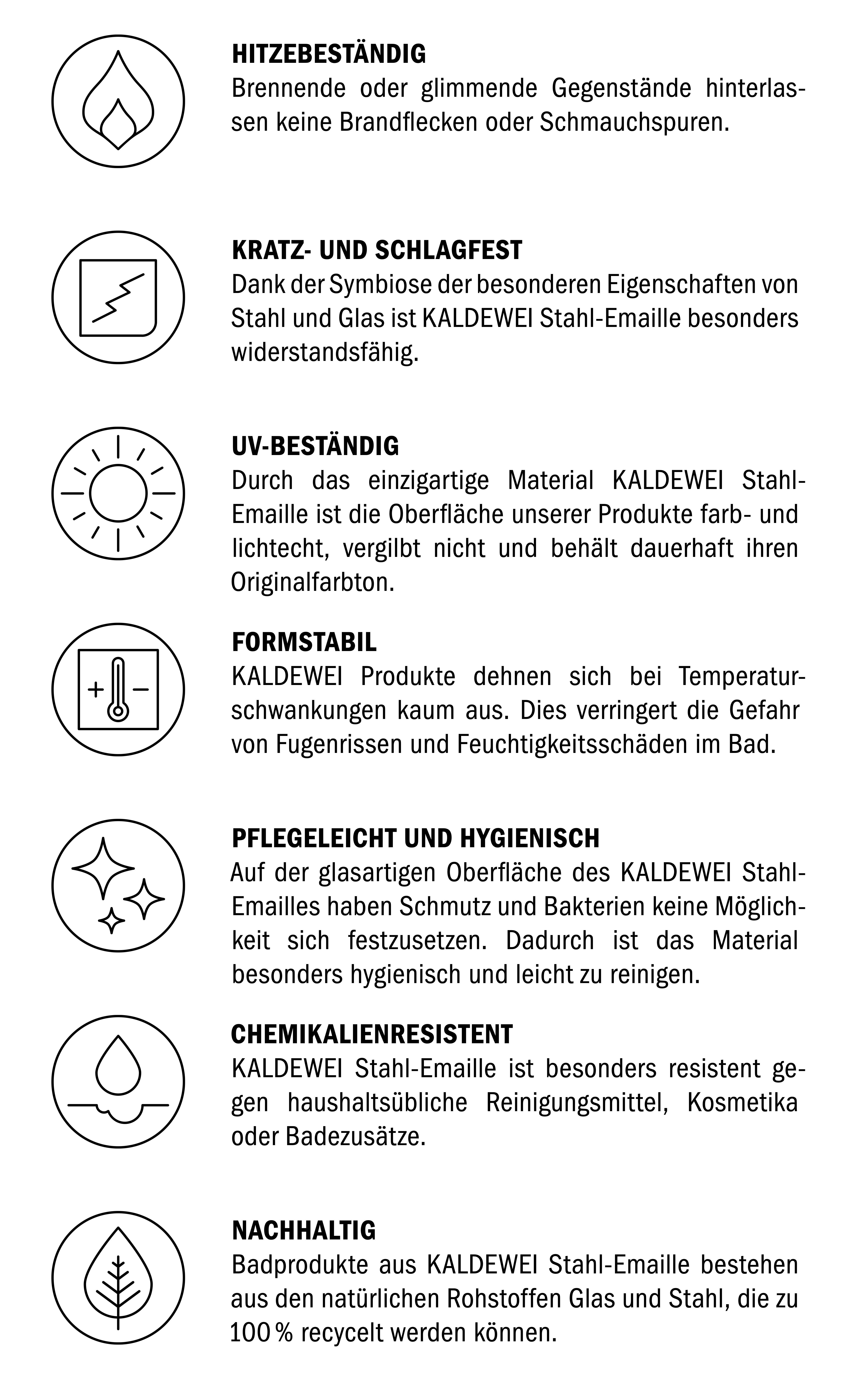 Stahl und Glas – zwei ganz authentische, natürliche Materialien, seit Jahrhunderten geschätzt und jedes für sich mit einzigartigen Materialeigenschaften ausgestattet. Stahl steht für Festigkeit, hohe Belastbarkeit, Robustheit und optimale Formbarkeit. Glas ist besonders widerstandsfähig gegen chemische oder thermische Beanspruchung und bietet eine exzellente Optik. Robuster Stahl und widerstandsfähiges Glas gehen in KALDEWEI Stahl-Emaille eine unzertrennliche Verbindung ein, die die jeweiligen Stärken jeden Materials zu einer idealen Symbiose verknüpft. Mit dem Anspruch eines Pioniers, der Grenzen immer weiter verschiebt, um das Gute noch besser zu machen, hat KALDEWEI die spezielle Rezeptur und die Fertigungsverfahren für KALDEWEI Stahl-Emaille fast ein Jahrhundert lang kontinuierlich weiterentwickelt, stetig verfeinert und entschieden verbessert.