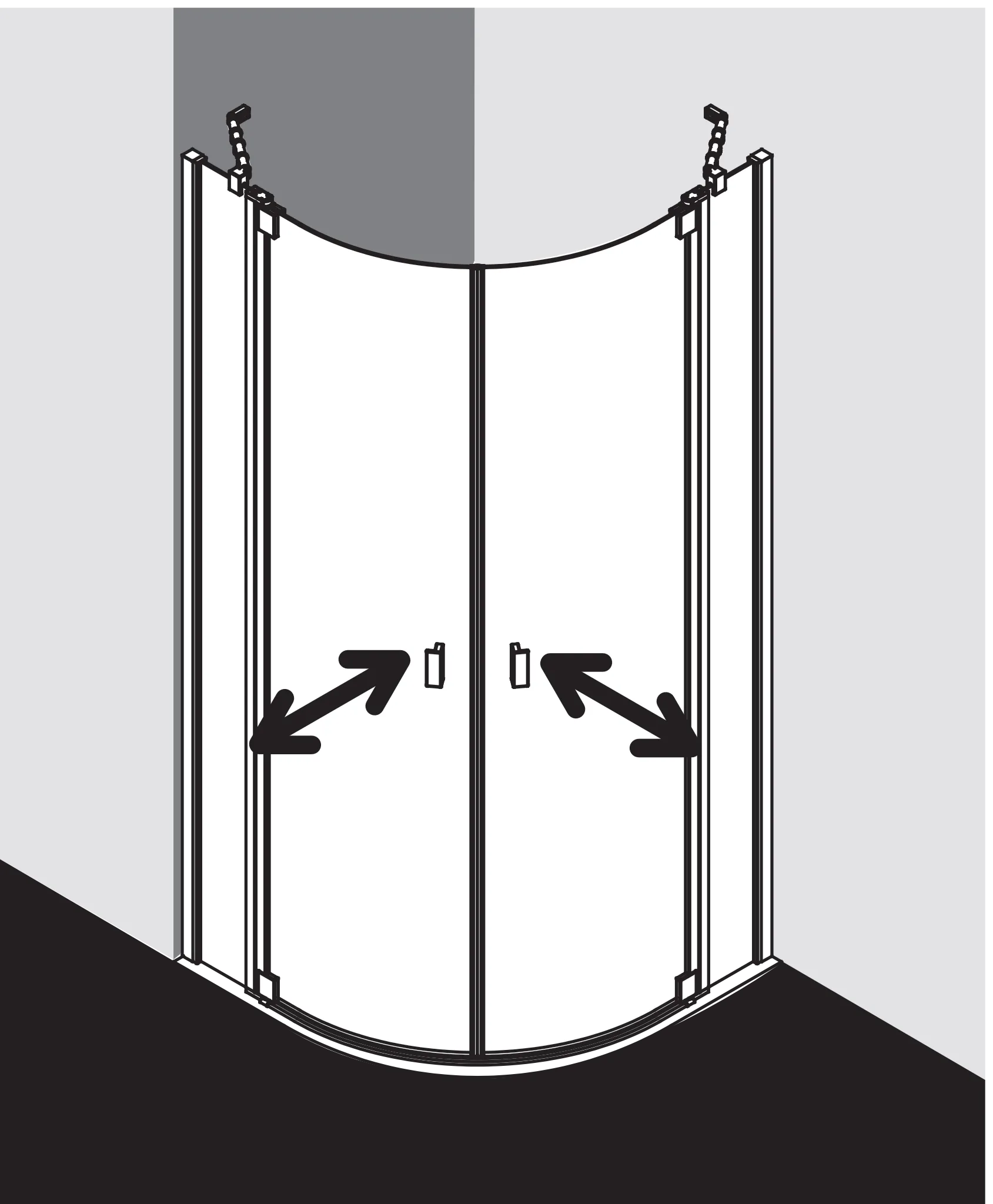 Produktinformationen "Kermi Duschdesign Viertelkreis-Duschkabine mit Pendeltüren mit Festfeldern „RAYA“ Glas Klar, Profile Silber Mattglanz, BV: 770 - 800 mm GAK: 755 - 785 mm WE: 780 - 810 mm H: 2000 mm"