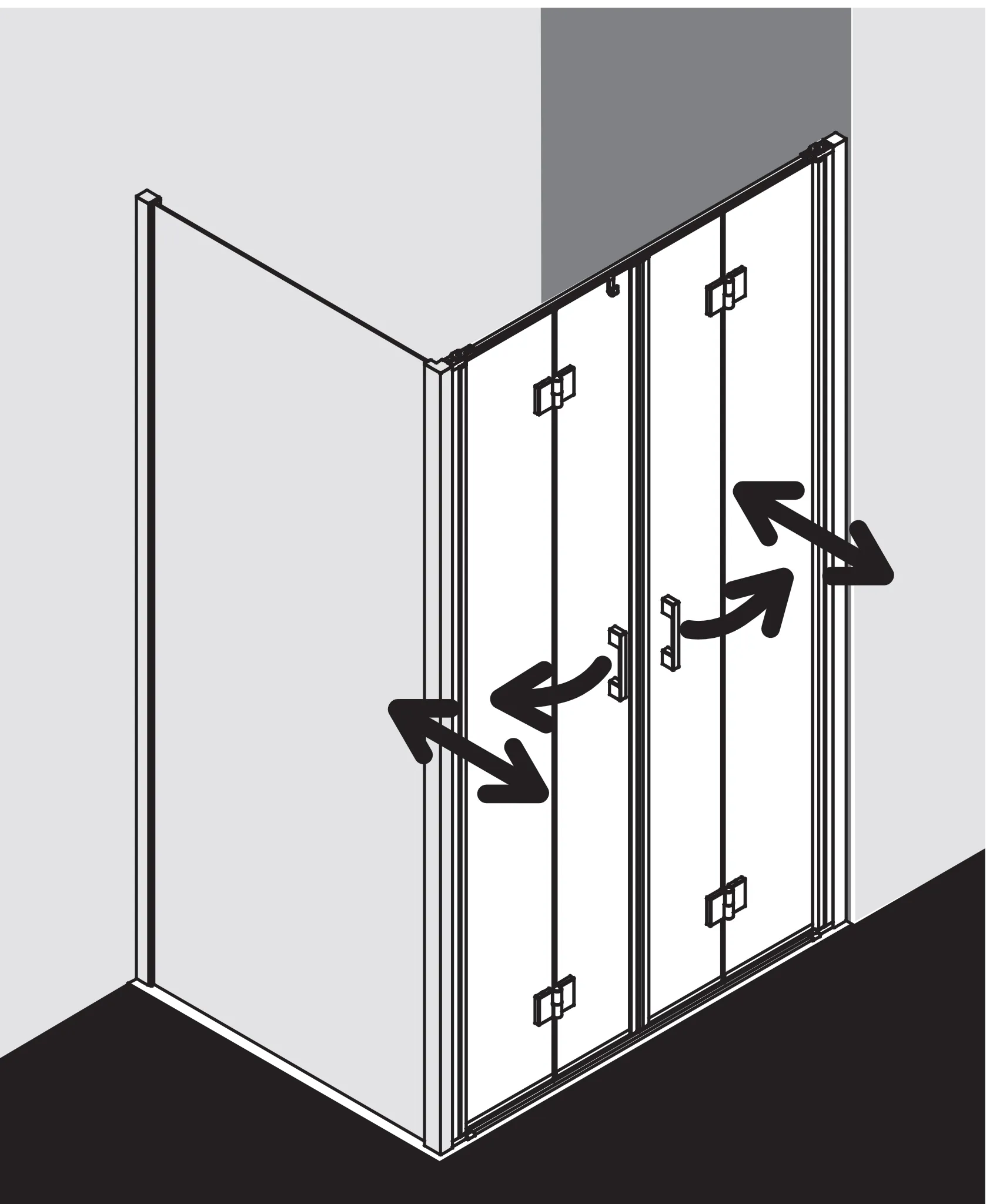 - Teilgerahmte Tür mit vier Glasflügeln, im Wandgelenkprofil 90 Grad nach innen und außen schwenkbar, im Beschlagsgelenk 180 Grad nach außen schwenkbar.