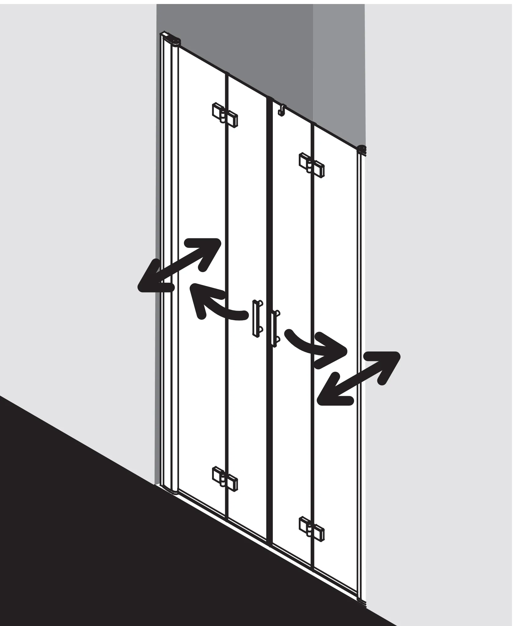 - Zum Einbau in einer Nische. Teilgerahmte Tür mit vier Glasflügeln, im Wandgelenkprofil 90 Grad nach innen und außen schwenkbar, im Beschlagsgelenk 180 Grad nach außen schwenkbar.