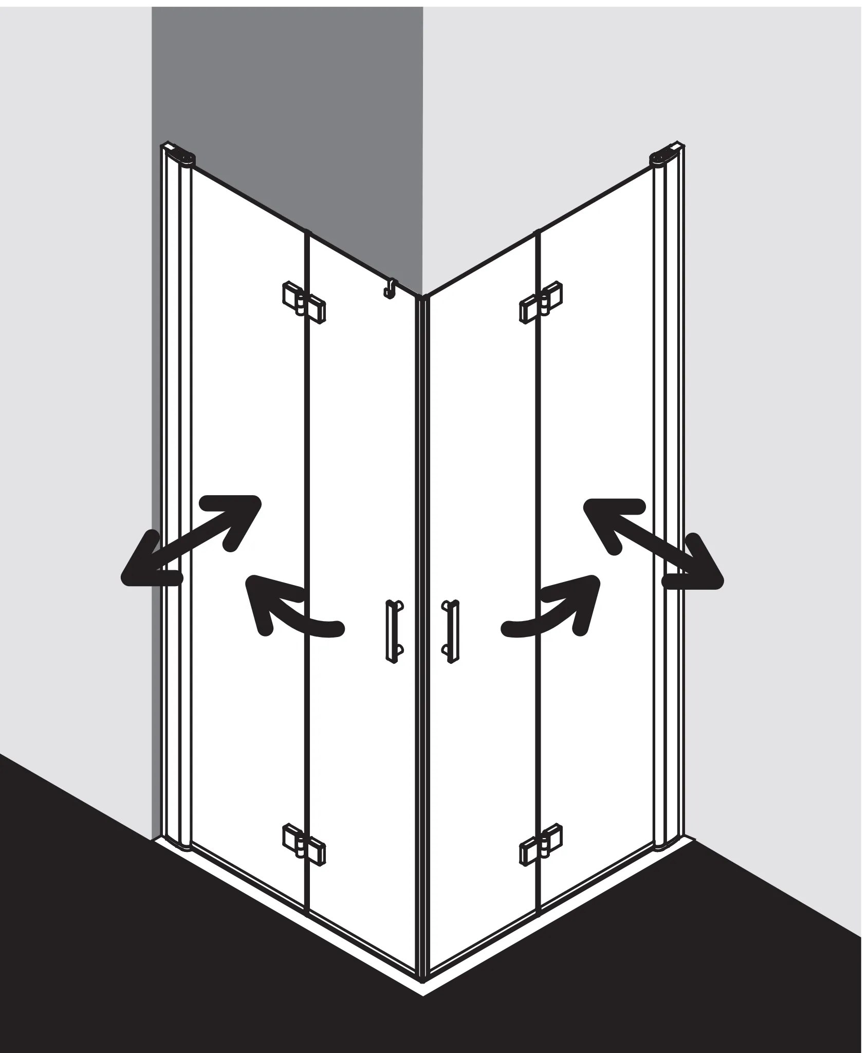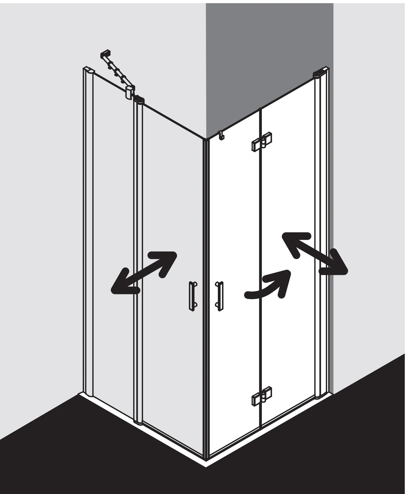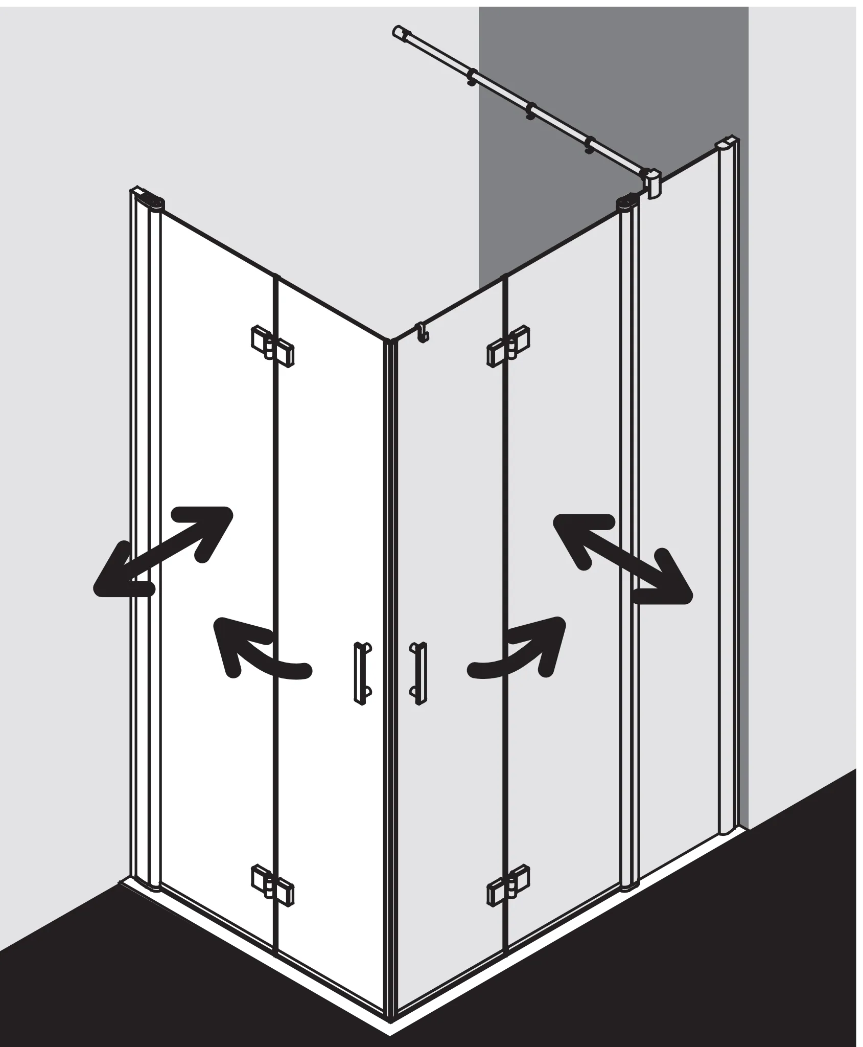 - Teilgerahmter Eckeinstieg mit vier Glasflügeln, im Wandgelenkprofil 90 Grad nach innen und außen schwenkbar, im Beschlagsgelenk 180 Grad nach außen schwenkbar. Verglasung mit 6 mm Einscheiben-Sicherheitsglas nach EN 12150, optional mit Pflegeleicht-Beschichtung KermiCLEAN.