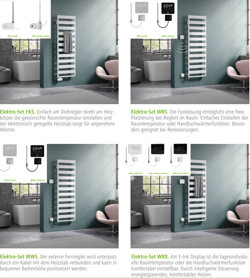 Die Variante FKS besteht aus einem elektronisch geregelten Heizstab inkl. Regler (Schutzart IPX4), der am Raumwärmer montiert wird. Länge des Kabels am Heizstab: ca. 1,2 mit Durch Umbau ist der Regler rechts oder links am Raumwärmer montierbar. Ausführung mit Stecker zum direkten Anschluss an einer Steckdose. Der Regler ist in weiß und chrom-silber verfügbar.