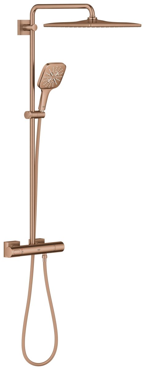 Rainshower SmartActive 310 CubeDuschsystem mit Thermostatbatterie für die Wandmontagebestehend aus:horizontal schwenkbarer 450 mm DuscharmAufputz-Thermostat mit Aquadimmer Funktionermöglicht den Wechsel zwischen:Kopfbrause Rainshower Mono 310 (26 568)mit Kugelgelenk, Drehwinkel ± 15°Handbrause Rainshower SmartActive 130 Cube (26 582)in der Höhe verstellbar mittels Gleitelementmit Performance GleiterBrauseschlauch Silverflex 1.750 mm (28 388)GROHE TurboStat Kompaktkartusche mit Dehnstoff-ThermoelementGROHE SafeStop Sicherheitssperre bei 38°CGROHE SafeStop Plus optional einsetzbarer Temperaturendanschlag bei 43°CGROHE CoolTouch kein Verbrennen an heißen OberflächenGROHE DreamSpray Perfektes StrahlbildGROHE SmartTip Showering Strahlumstellung per TastendruckGROHE Long-Life OberflächeGROHE Water Saving 9,5 l/min DurchflusskonstanthalterGROHE FastFixation obere Konsole variabelSpeedClean Antikalk-Systemfür Durchlauferhitzer ab 18 kW/h geeignetMindestdurchfluss 7 l/minDR-MessingSerie / Kollektion: Rainshower SmartActive 310Modell: 26837Typ: DuschsystemAnschluss: Außengewinde Durchflussmenge (max.): 9,5 l/minBeleuchtung: nein Anschlussdurchmesser: 1/2″ Temperaturregelung: thermostatisch Abmessungen:Breite: 317 mmHöhe: 1118 mmTiefe: 472 mmDurchmesser &8960;: 310 mm