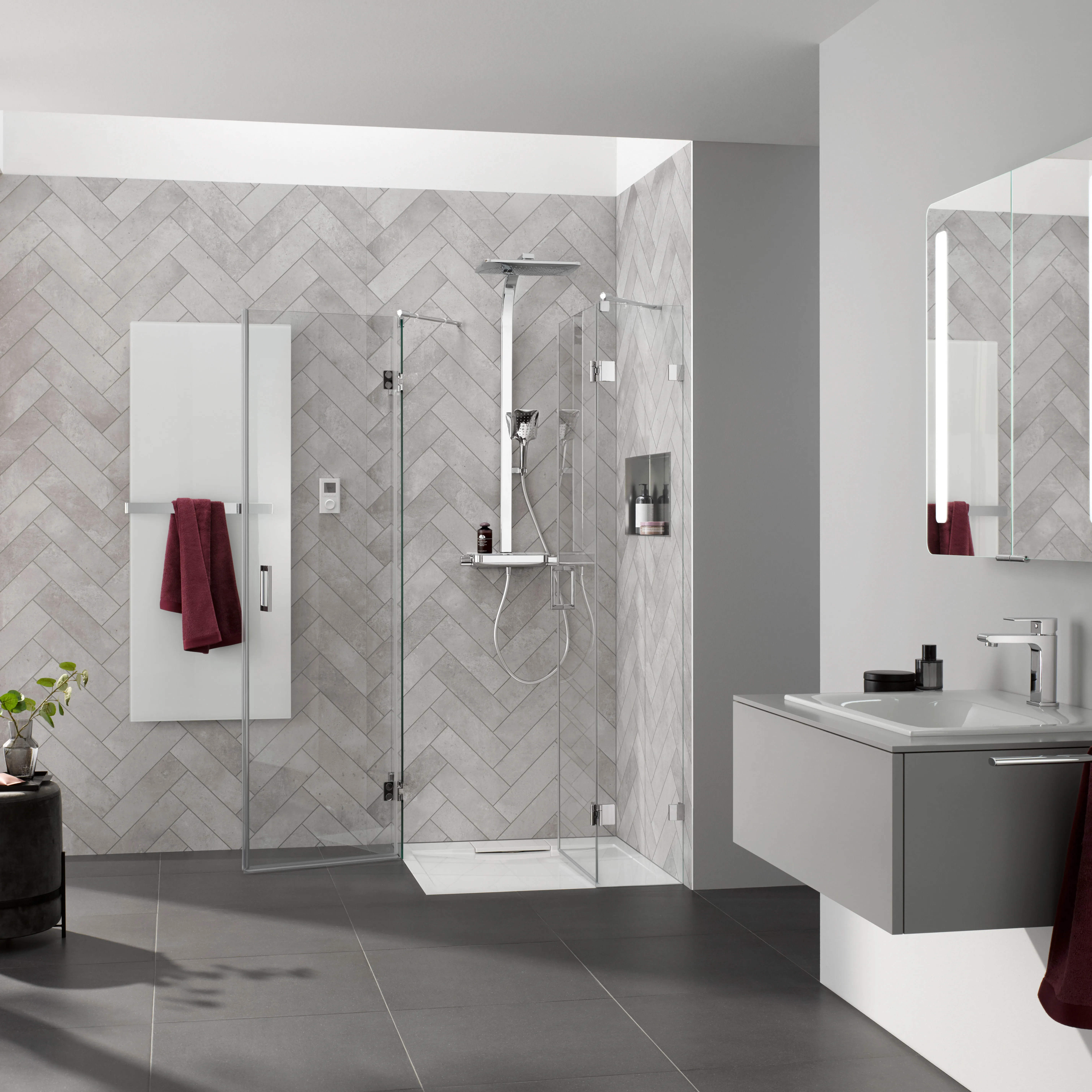 HSK rahmenlos Raumnische pendelbar 3-teilig links „Aperto Pur“ für Nische Glas Klar hell, Scharniere Chromoptik (Alu Hochglanz poliert), Sondergröße