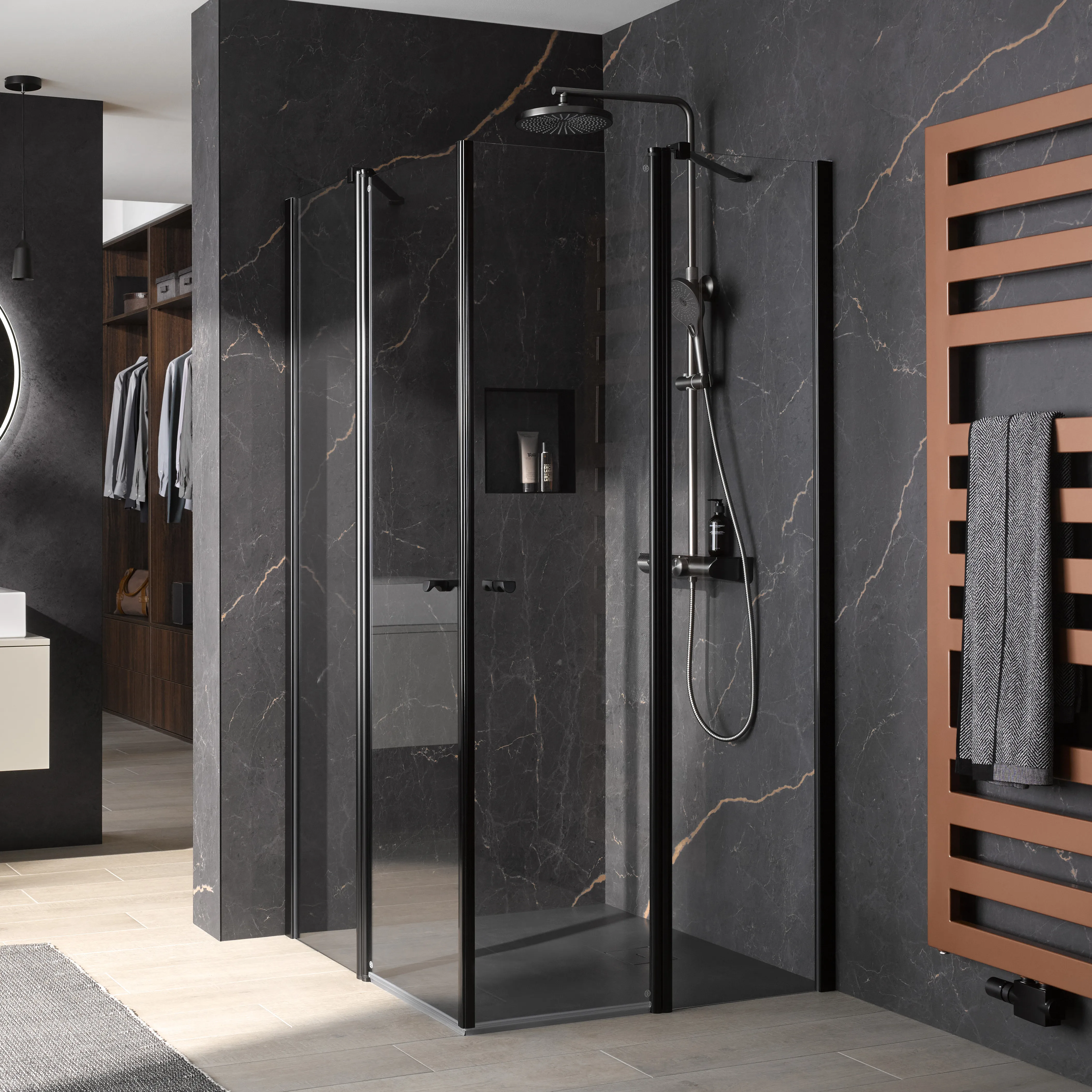 Walk In Exklusiv 2.0 Drehfalttür pendelbarEine großzügige, barrierefreie Dusche in einem beengten Badezimmer: Bei Bedarf können die 6mm starken Glaselemente einfach gefaltet und weggeschwenkt werden. Das schafft viel zusätzlichen Raum. Ganzmetall-Drehlager und Scharniere machen das Handling kinderleicht, der Heb-/Senk-Mechanismus bringt die Elemente sanft und sicher immer wieder in die richtige Position zurück. Glasfarbe und Profilfarbe wählbaroptional mit Oberflächenveredelung6 mm Echtglas (ESG)innen glasbündige Scharniere und Puffergriffserienmäßig wird Scharnierform Softcube geliefertoptional Scharnierform Classic wählbarserienmäßig wird Puffergriff Exklusiv (52) geliefert, zusätzlicher Griff am zweiten Türelement möglichBitte Anschlag der Tür angeben. Serie / Kollektion: Exklusiv 2.0Typ: Walk-In-DuschkabineElementmaß in cm: 88 - 90T1 (erstes Element): 37,3T2 (Element wandseitig): 50,3Abmessungen:Breite: 900 mmHöhe: 2000 mm