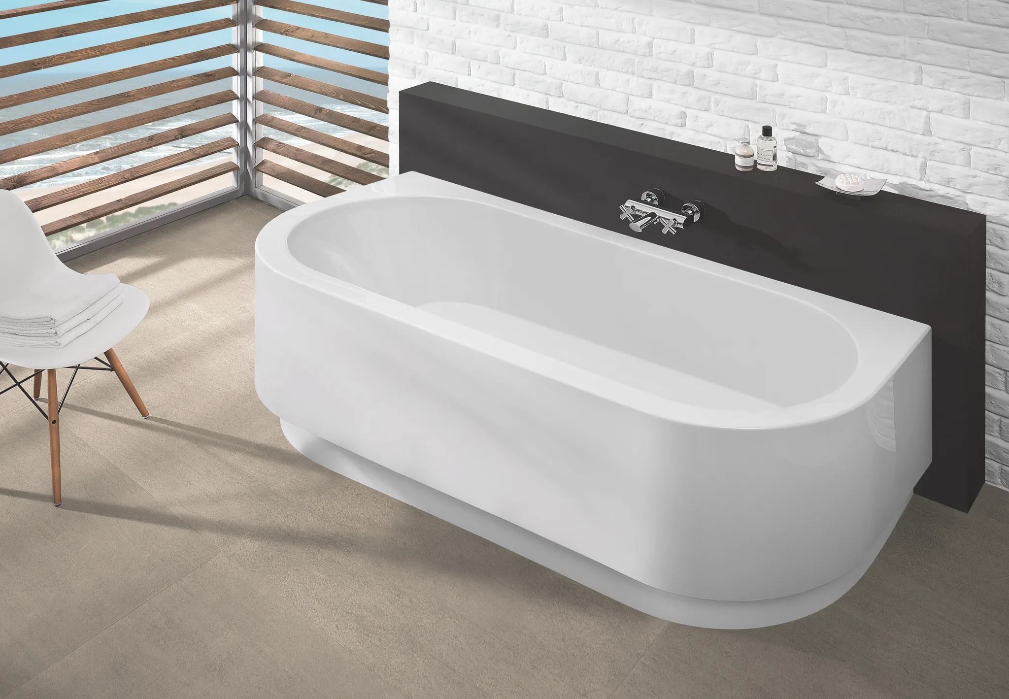 Hoesch Badewanne „Happy D.“ vorwand halbkreis 181,6 × 80,8 cm, mittig, mit Schürze in Weiß