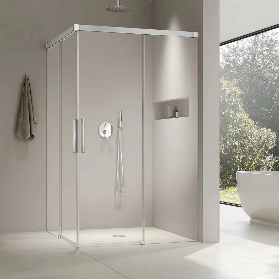 Kermi NICA Eckeinstieg 2-teilig (Gleittüren bodenfrei) - Halbteil mit WandprofilKompletter Eckeinstieg besteht aus NI C2R Eckeinstieg Halbteil rechts und NI C2L Eckeinstieg Halbteil links.Halbteile unterschiedlicher Breite beliebig kombinierbar.Teilgerahmter Eckeinstieg mit zwei Gleittürsegmenten, je nach einer Seite öffnend, mit zwei Festfeldern.Verglasung mit 6 mm Einscheiben-Sicherheitsglas nach EN 12150, optional mit Pflegeleicht-Beschichtung KermiCLEAN.Profile aus hochwertigem eloxiertem Aluminium, Griffe aus hochwertigem Metall.Verstellmöglichkeit im Wandprofil 25 mm.Gleittürsegment mit Soft-Open- und Soft-Close-Funktion, zur Reinigung nach innen schwenkbar. Hochwertige kugelgelagerte Laufrollen.Durchgehende Magnetleisten und Dichtprofile, waagerechte Dichtleiste mit Wasserabpralleffekt.Mit Bodenschwelle (Höhe 6 mm), oder ohne Bodenschwelle (bodenfrei) installierbar.NICA erfüllt die Anforderungen der Spritzwasserschutzprüfung nach DIN EN 14428.Im Lieferumfang enthalten: Befestigungsmaterial.Made in Germany.Geprüft nach DIN EN 14428 (CE) und PPP 53005 (TÜV / GS). 20 Jahre Ersatzteil-Nachkaufsicherheit nach Auslauf des Modells. Qualitätssicherungssystem zertifiziert nach DIN EN ISO 9001:2015. Umweltmanagement zertifiziert nach DIN EN 14001:2015. Energiemanagement zertifiziert nach DIN EN 50001:2011.Der Preis für den kompletten Eckeinstieg addiert sich aus einem rechten plus einen linken Halbteil.Serie / Kollektion: NICAModell: NIC2LMaterial: Sicherheitsglas/AluminiumTyp: DuschtürAbmessungen:Breitenverstellbereich: 895 - 920 mmGlasaußenkante: 890 - 915 mmWanneneinbaumaß: 905 - 930 mmHöhe: 1850 mm