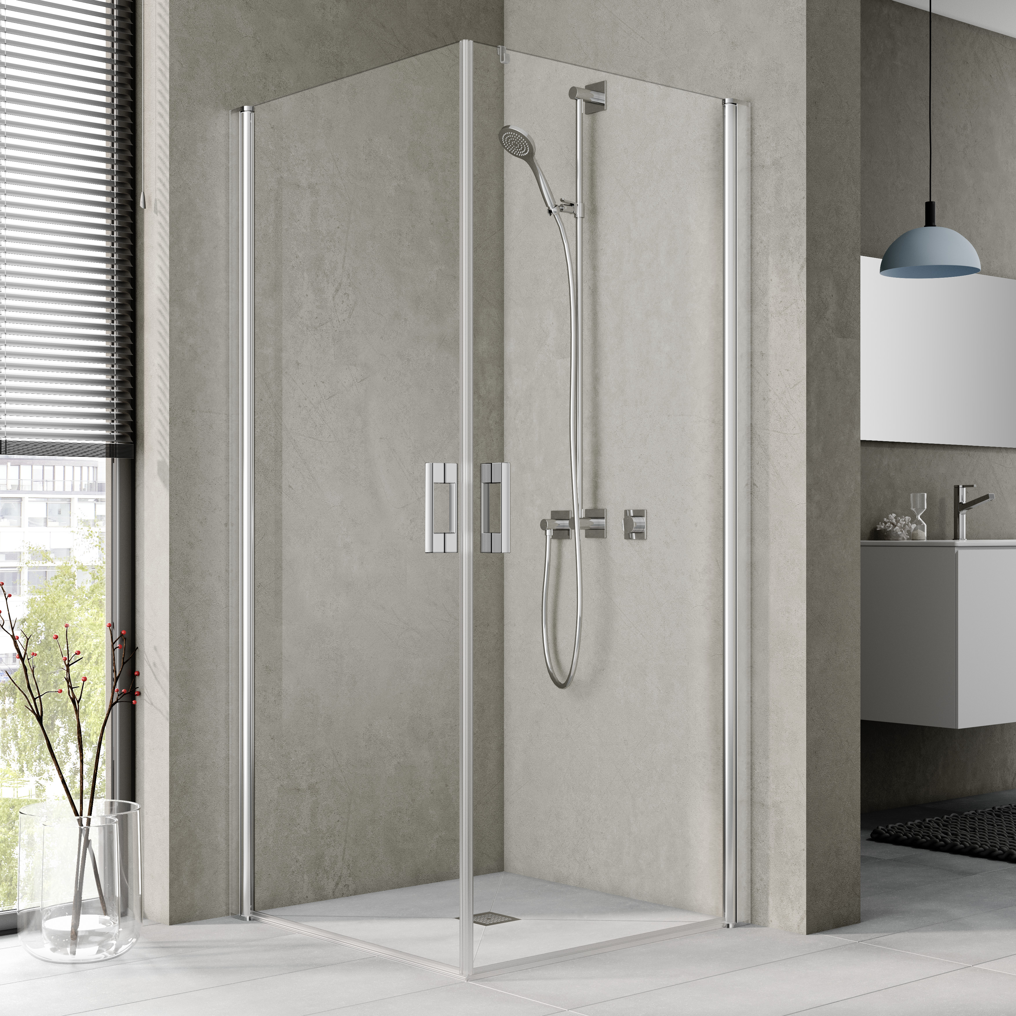 Kermi Pendeltür mit Festfeldern für Nische und Ecke „PEGA“ Glas Klar, Profile Silber Hochglanz, BV: 1150 - 1200 mm GAK: 1150 - 1175 mm WE: 1150 - 1200 mm H: 1850 mm