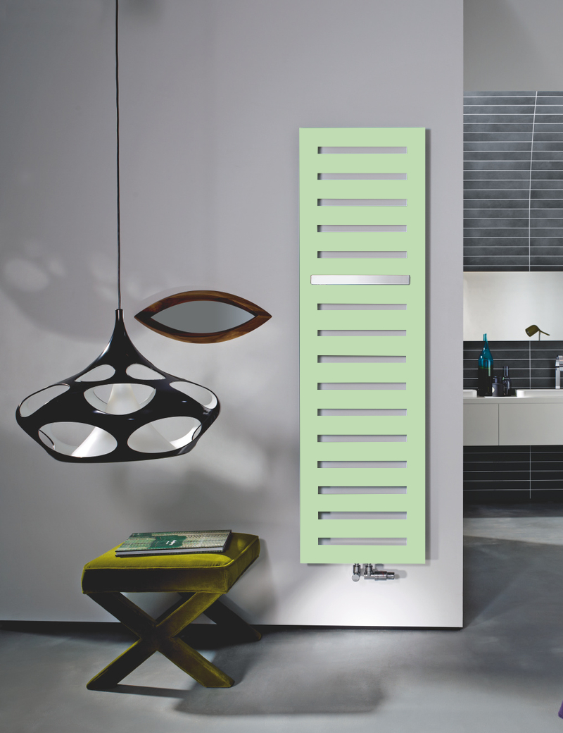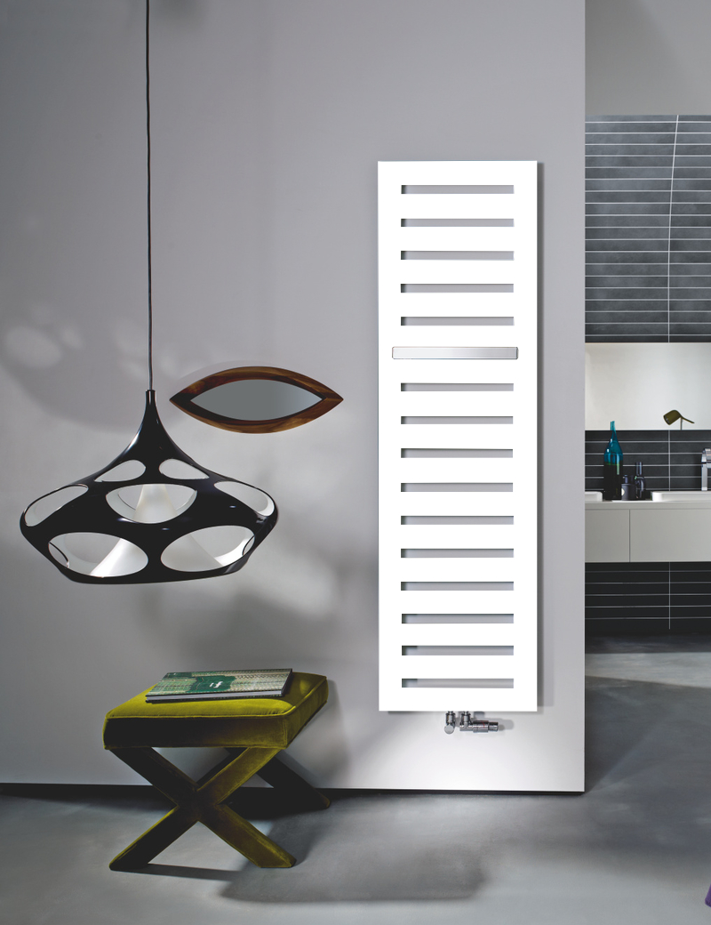 Design-Heizkörper Zehnder Metropolitan Bar, rein elektrisch, für Einsatz als Bad- und Handtuchheizkörper. Flächig wirkender Heizkörper mit eingelassenen Schlitzen bestehend aus horizontal angeordneten Flachrohren 70 × 8 mm, die mit einem umlaufenden Dreikantprofilrahmen ohne sichtbare Schweißstellen verbunden sind. Mit gleichmäßiger Struktur inklusive Handtuchhalter. Zehnder Metropolitan Bar, rein elektrisch gefüllt mit Wärmeträgerflüssigkeit für Netzanschluss 230 Volt mit Anschlusskabel 1,2 m lang mit Stecker. Trockenlaufschutz gegen Betrieb ohne ausreichende Wärmeträgerflüssigkeit. Standardausführung mit Pulverlackierung im Farbton RAL 9016, auf Wunsch in Sonderfarbe. Lieferung montagefertig mit formschönen Wandkonsolen.